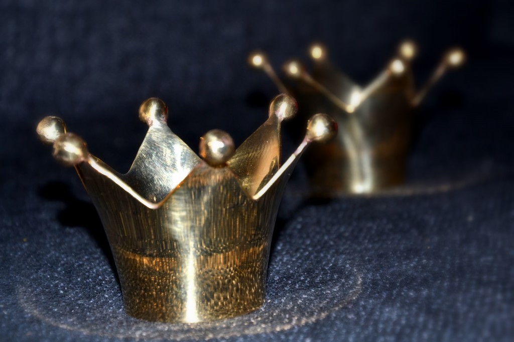 Ljusstakar formade som kronor. Egentligen är de helt guldiga (inte så grumligt guldiga) men underlaget speglades i kronan.