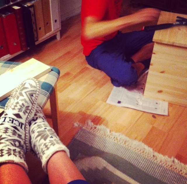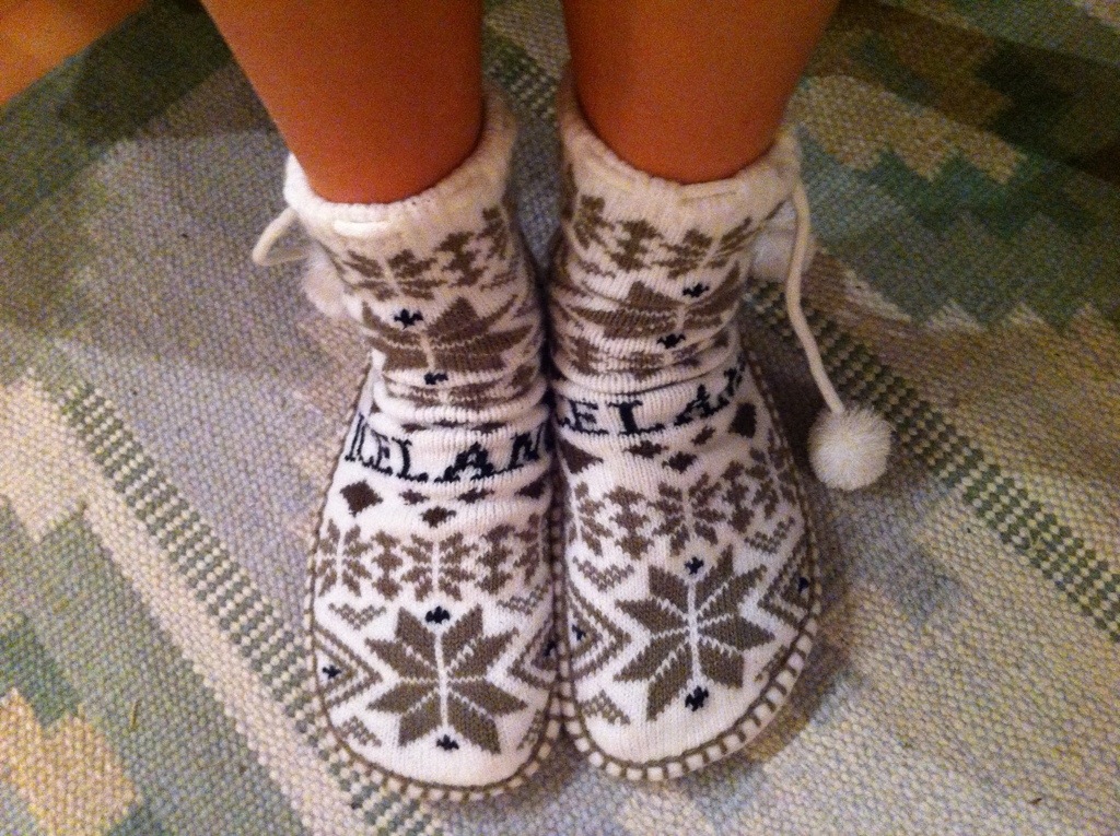 Chillar med pappa… Publicerat den oktober 6, 2012 · 1 kommentar Eller ja, rättare sagt: jag chillar medan pappa jobbar med en hylla, hehe… Har mina mystofflor/strumpor från Island på mig som jag fick. Nä, nu ska jag allt vara en duktig dötra och hjälpa till. 🙂 Hehe, kalle anka-fötter